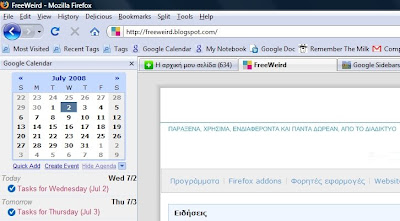 Αν και πιστός οπαδός του Netvibes, διαπίσωσα πως το iGoogle έχει μια ενδιαφέρουσα δυνατότητα αξιοποίησης των gadgets του, επιτρέποντάς μας να τα ενσωματώνουμε στη sidebar του browser μας (προς το παρόν η λειτουργικότητα αυτή υποστηρίζεται μόνο από τους Firefox και Opera). Για όσους δεν γνωρίζουν, sidebar είναι η μπάρα που εμφανίζεται στα αριστερά του browser σας όταν π.χ. ανοίγετε το ιστορικό.