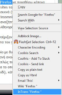 Το πλεονέκτημά του, όμως, είναι ότι χρησιμοποιεί το πολύ καλό λεξικό του in.gr, το οποίο ίσως και να είναι το καλύτερο ελληνικό online λεξικό. Επιπλέον, δεν επιβαρύνει καθόλου τον Firefox, αφού προσθέτει απλώς μια επιπλέον καταχώρηση στο μενού του δεξιού κλικ.